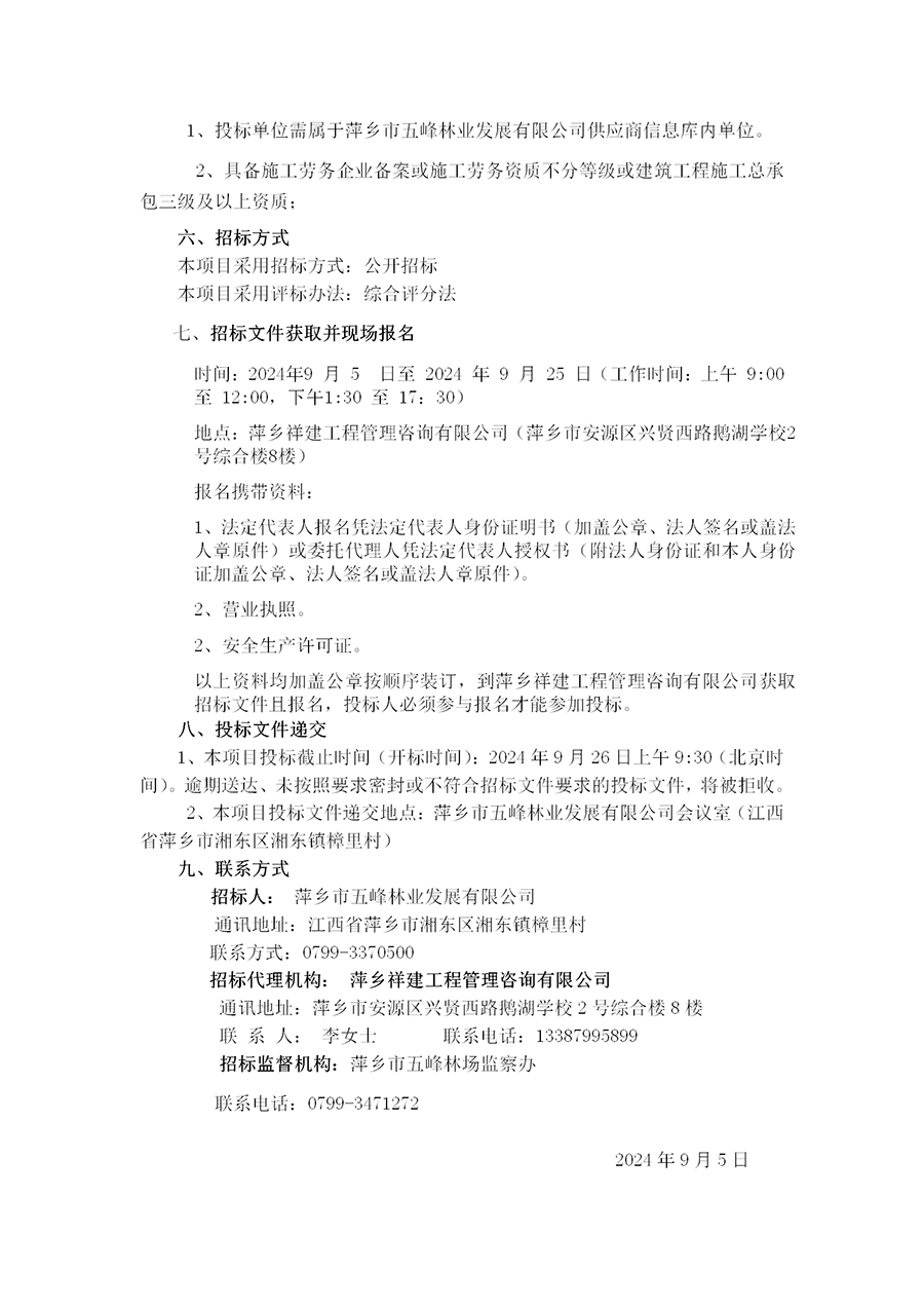 萍鄉(xiāng)市五峰林業(yè)發(fā)展有限公司2025年度工程專業(yè)承包供應(yīng)商、施工勞務(wù)供應(yīng)商、工程服務(wù)供應(yīng)商預(yù)選庫(kù)建立項(xiàng)目招標(biāo)公告