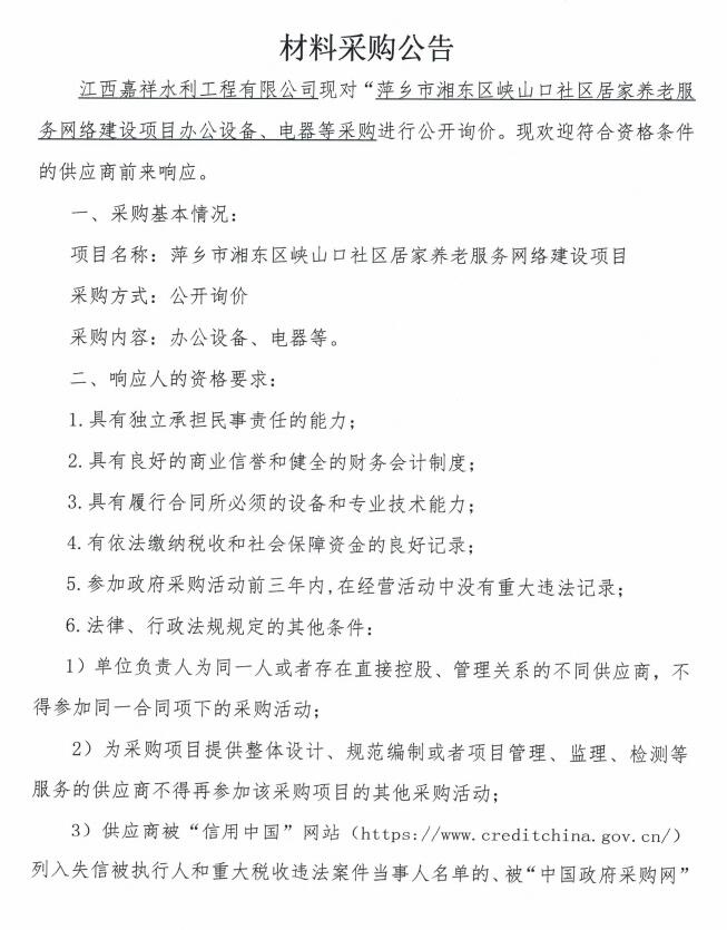 江西嘉祥水利工程有限公司現(xiàn)對“萍鄉(xiāng)市湘東區(qū)峽山口社區(qū)居家養(yǎng)老服務(wù)網(wǎng)絡(luò)建設(shè)項目-中心城區(qū)居家養(yǎng)老服務(wù)中心采購進行公開詢價?,F(xiàn)歡迎符合資格條件的供應(yīng)商前來響應(yīng)。